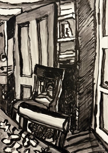 Sketch: Living Room, 2025, India ink on paper, 5 x 7"h